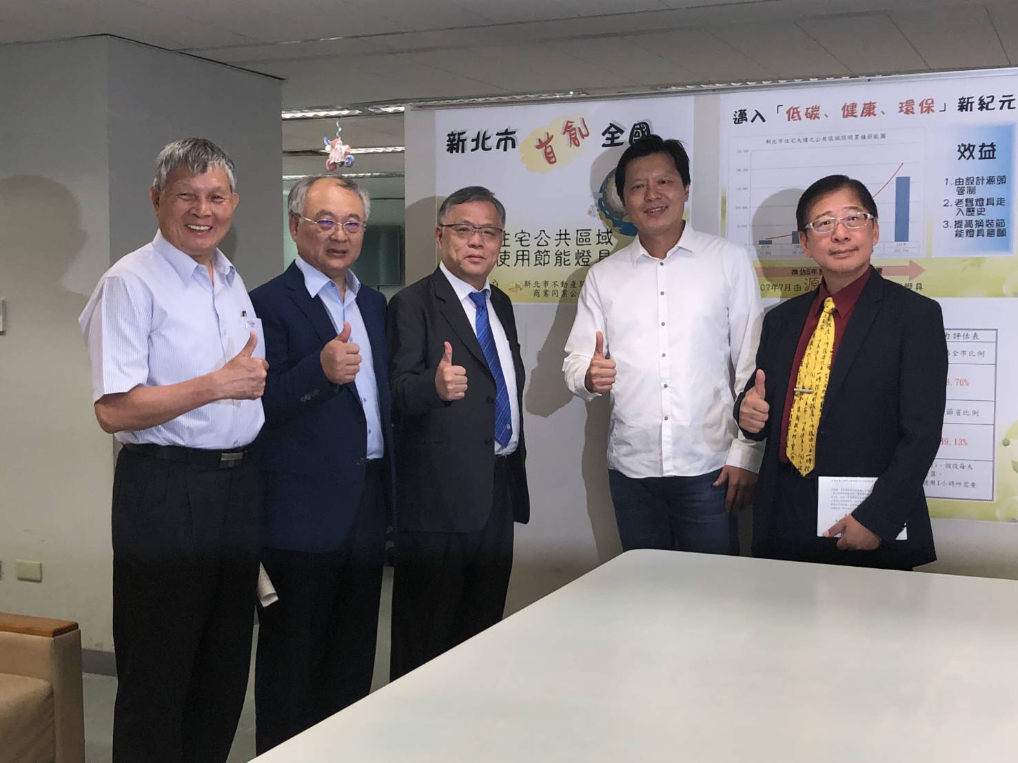 新北市首創全國,要求新建住宅在核發建造執照、使用執照時,公共區域必須全面使用節能燈具,從源頭管制,這項政策立刻獲得新北市不動產開發商業同業公會及建築師公會的響應,並與市府簽署同意書,工務局長朱惕之與建築師公會理事長洪迪光、不動產開發公會理事長劉炳煌,特別於7月20日公開說明,強調新北市的居住環境將正式邁入「低碳、健康、環保」新紀元。