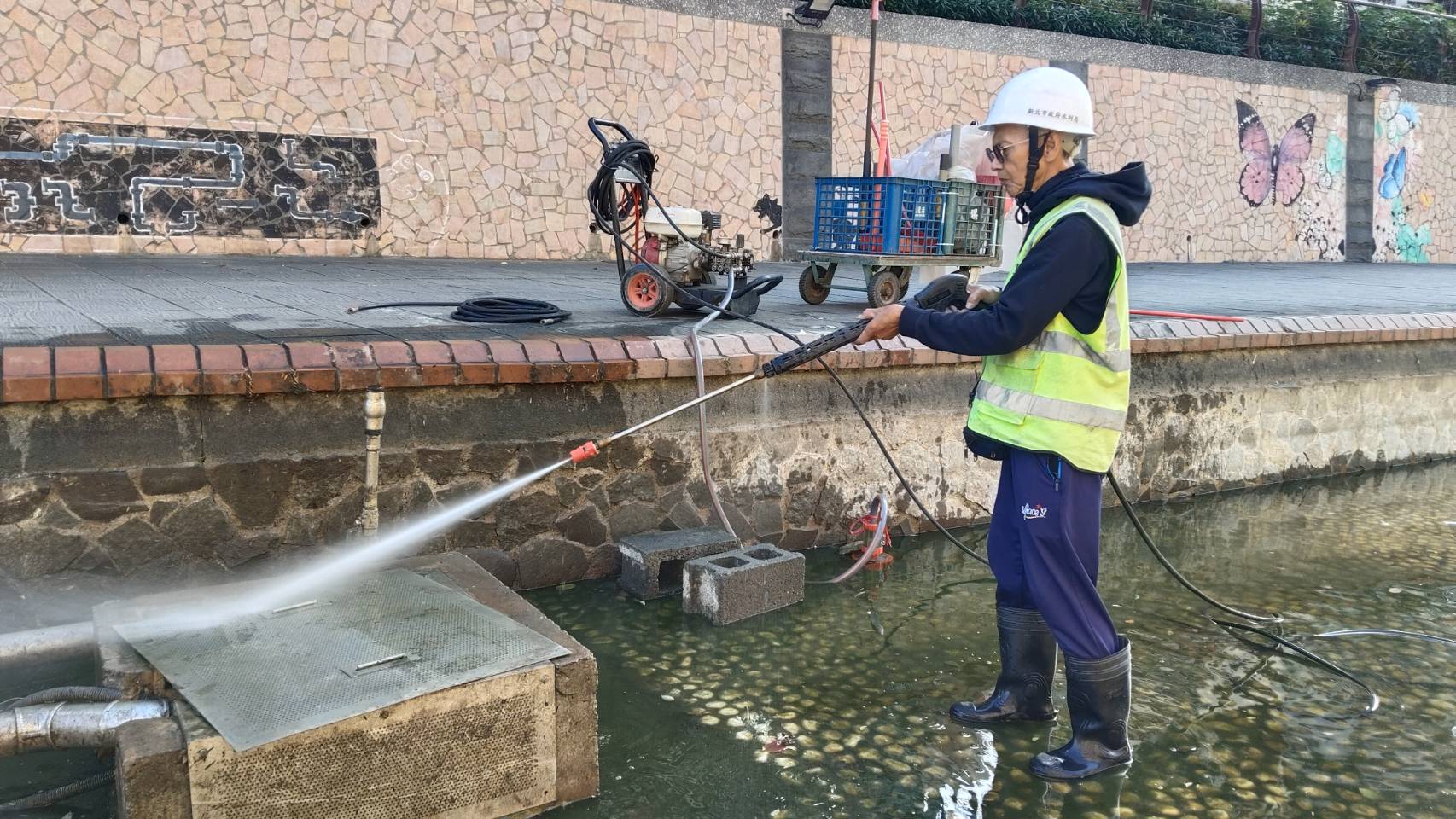 由於河道水位平時維持在 50 至 80 公分,為進行清洗,必須將水位大幅降至僅剩 3 至 5 公分。在水位調整期間,也必須同步細心執行生態維護,由工作人員徒手撈取魚類及烏龜,並將其妥善移置到安全水域,以確保河廊生物能在整治期間安全過渡,展現水利局對生態的專業堅持。