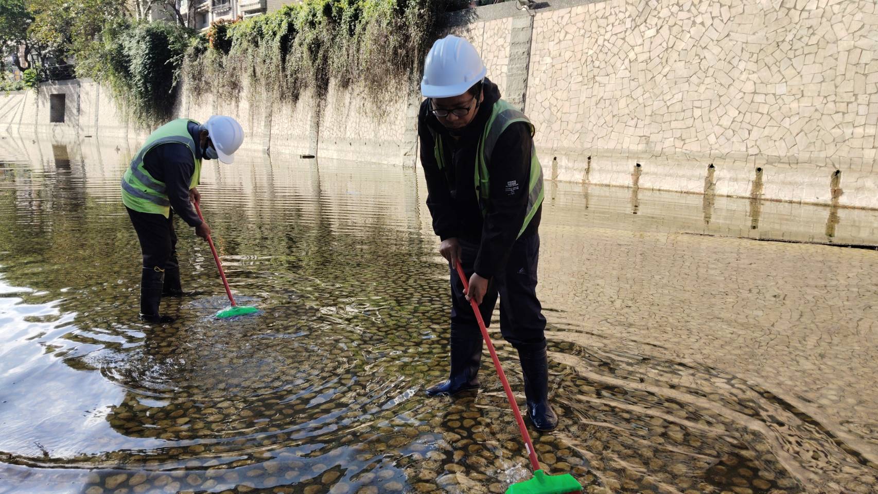 - 【新北市訊】 新北市水利局已於 12 月 10 日順利完成新莊中港大排長達 1.8 公里的年終清洗作業。為確保居民在步道上照常通行,此次作業全程採純人工涉水清洗,整治後河廊水面更顯清澈、步道煥然一新,讓居民能在更舒適、更安全的環境中散步休憩,同時也周全兼顧了生態保護。
