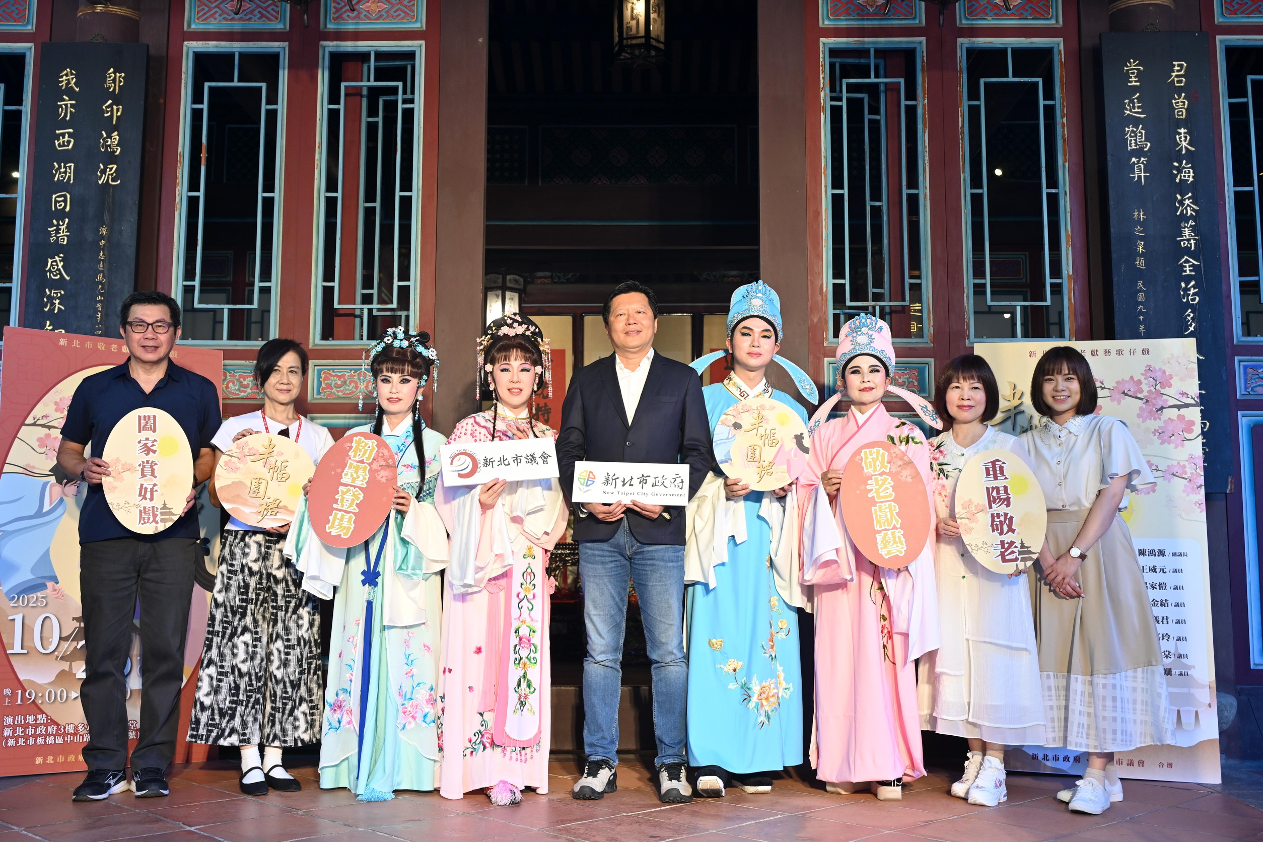 - 【新北市訊】新北市政府攜手市議會共演「敬老獻藝歌仔戲」,今(16)日於國定古蹟林本源園邸(板橋林家花園)定靜堂舉辦記者會,議員粉墨登場演出精彩橋段,副市長朱惕之也揭曉今年演出劇碼《半幅圍裙》,並邀請市民朋友10月26日晚上7時,前往新北市政府3樓多功能集會堂看歌仔戲。